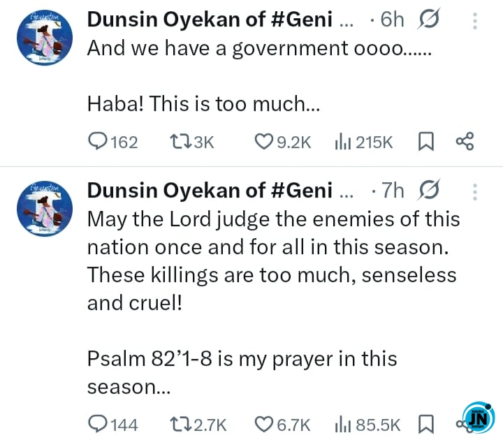 He took to his official X page to share his sorrow and outrage over the increasing insecurity, lamenting the loss of innocent lives and the seeming ineffectiveness of government security measures. Oyekan’s post has since generated significant attention online, sparking discussions among his followers and the wider public about the state of safety in Nigeria.