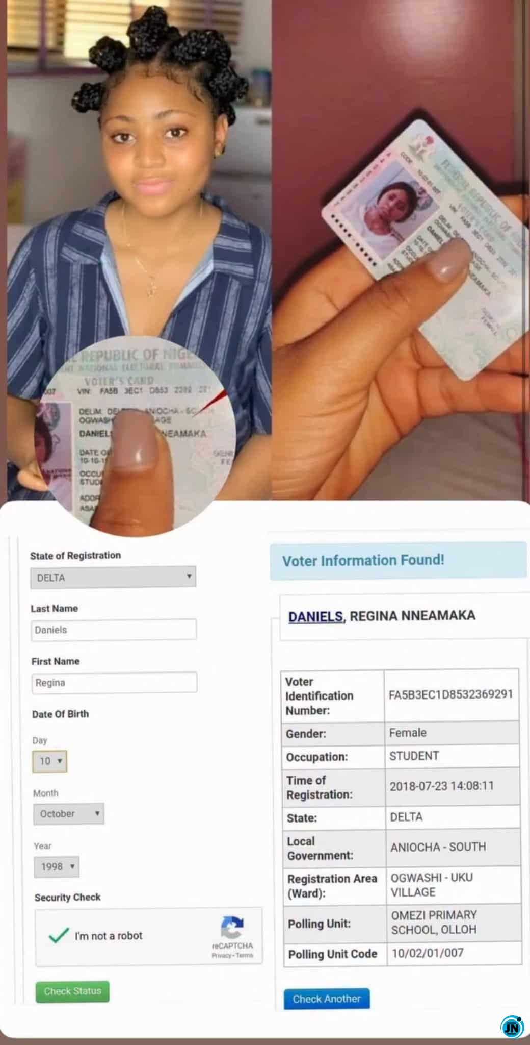 According to the voter’s card shared by the X user @princessluna, Regina Daniels was born on October 10, 1998, and hails from Aniocha South Local Government Area in Delta State.