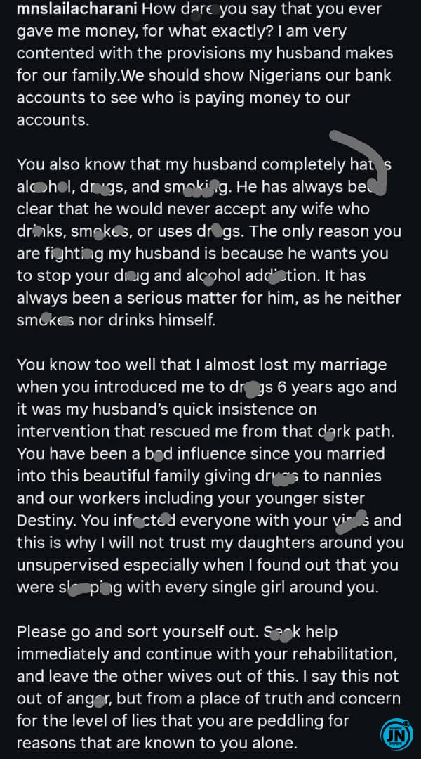 “You know too well that I almost lost my marriage when you introduced me to drugs six years ago, and it was my husband’s quick insistence on intervention that rescued me from that dark path. You have been a bad influence since you married into this family — giving drugs to nannies and workers, including your younger sister Destiny. You infected everyone with your virus, and this is why I will not trust my daughters around you unsupervised, especially after I found out that you were sleeping with every single girl around you. Please go and sort yourself out. Seek help.”