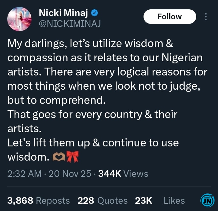 In her latest post on her official X handle, Minaj urged her global audience to show understanding rather than criticism when responding to the actions or decisions of Nigerian artists.