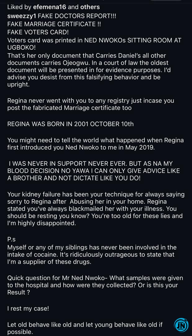In addition to the voter card allegations, Swezzy alleged that Ned Nwoko leveraged his kidney failure as a manipulative tactic, purportedly as an apology after reportedly abusing Regina. He accused Ned of using illness as a means of emotional blackmail to control or pressure Regina into compliance with his wishes.