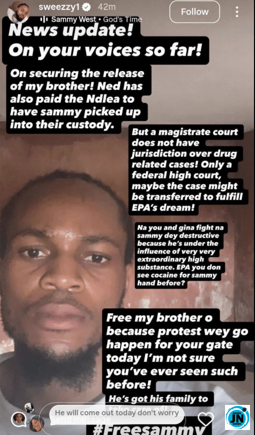Lawrence elaborated on the situation, stating: “Ned has also paid NDLEA to have Sammy picked up into their custody. But a magistrate court does not have jurisdiction over drug-related cases, only a federal high court. This action bypasses proper legal channels and appears to be part of a larger scheme against my brother.”