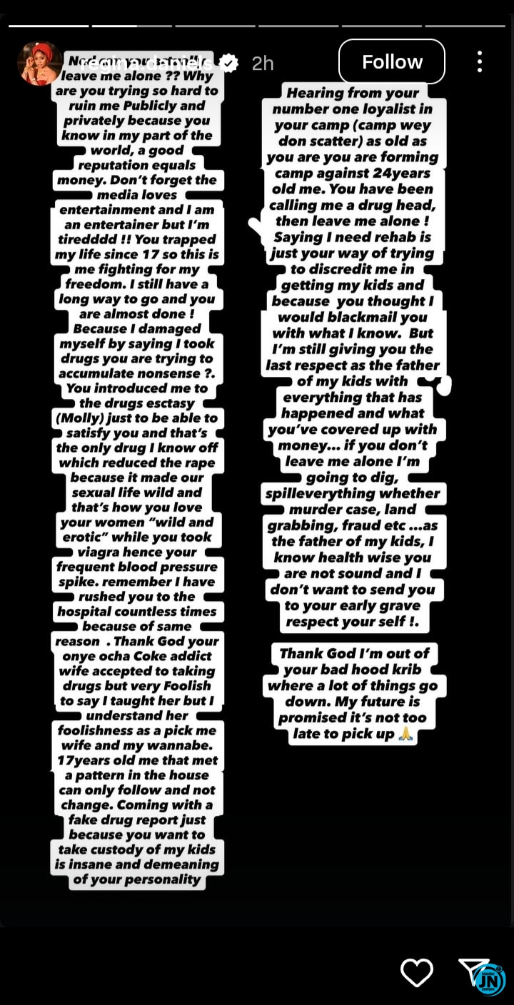 “Ned can you just leave me alone ?? Why are you trying so hard to ruin me Publicly and privately because you know in my part of the world, a good reputation equals money. Don’t forget the media loves entertainment and I am an entertainer but I’m tiredddd!! You trapped my life since 17 so this is me fighting for my freedom. I still have a long way to go and you are almost done! Because I damaged myself by saying I took drugs you are trying to accumulate nonsense? You introduced me to the drugs ecstacy (Molly) just to be able to satisfy you and that’s the only drug I know of which reduced the rape because it made our sexual life wild and that’s how you love your women ‘wild and erotic’ while you took viagra hence your frequent blood pressure spike. Remember I have rushed you to the hospital countless times because of same reason. Thank God your onye ocha Coke addict wife accepted to taking drugs but very foolish to say I taught her but I understand her foolishness as a pick me wife and my wannabe. 17 years old me that met a pattern in the house can only follow and not change. Coming with a fake drug report just because you want to take custody of my kids is insane and demeaning of your personality.”