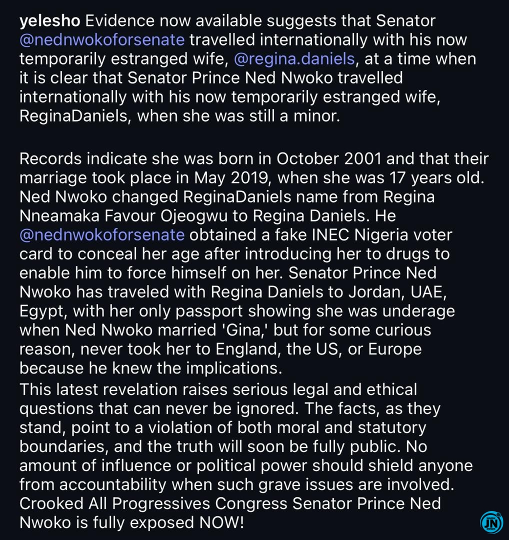 New evidence, reportedly revealed by activist Omoyele Sowore, has reignited heated controversy surrounding billionaire businessman and politician Ned Nwoko, alleging that he secretly married popular Nollywood actress Regina Daniels when she was still underage. This revelation has sparked widespread outrage online, as many Nigerians are now demanding a full investigation into the matter and accountability from the parties involved.