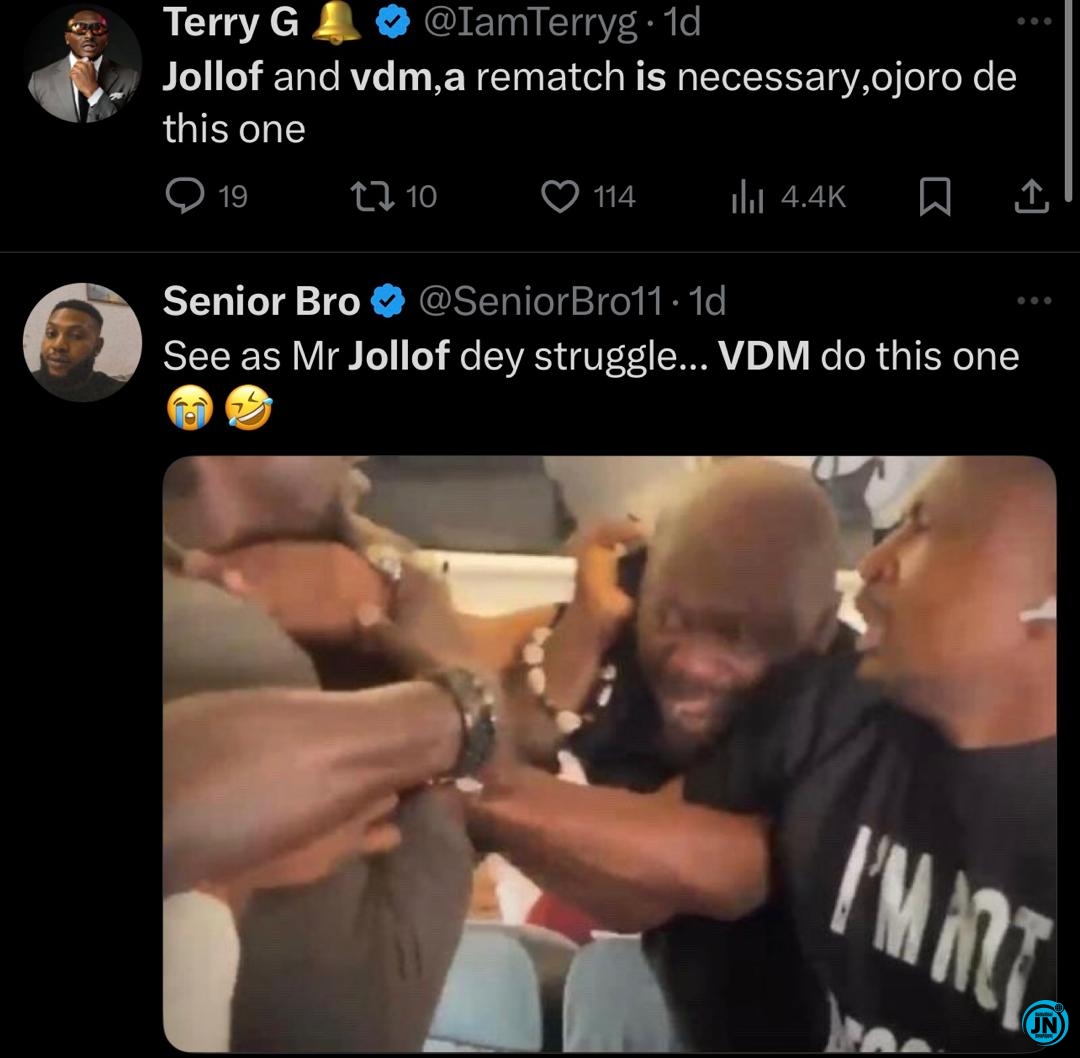 Reacting to the online uproar, Terry G took to his X (formerly Twitter) account, where he expressed his opinion that the incident deserves a proper continuation in the form of a rematch. “Jollof and VDM, a rematch is necessary, ojoro de this one,” he tweeted, emphasizing that fans deserve a more decisive and entertaining resolution to the widely discussed moment.