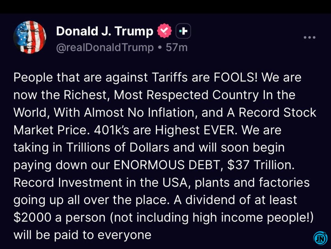U.S. President, Donald Trump, has once again taken to social media to celebrate what he describes as historic economic achievements under his administration, asserting that the United States has reached unprecedented levels of prosperity and global respect.