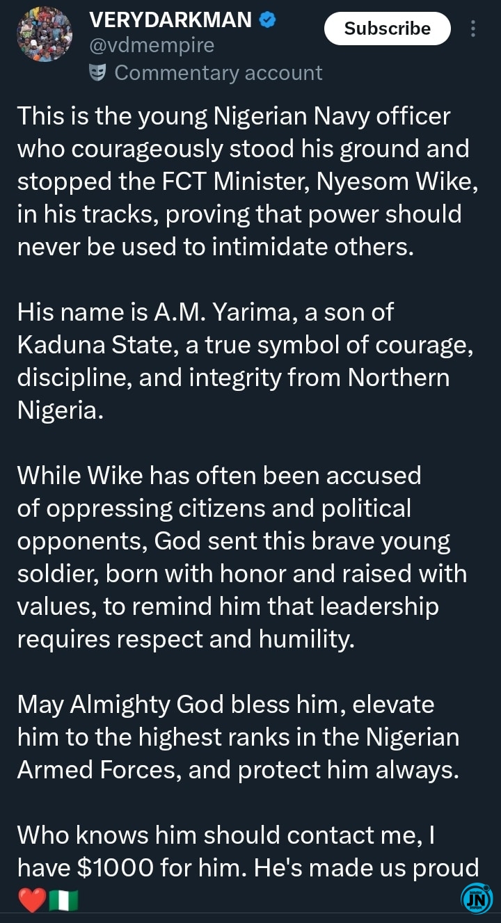 VDM’s statement read: “This is the young Nigerian Navy officer who courageously stood his ground and stopped the FCT Minister, Nyesom Wike, in his tracks, proving that power should never be used to intimidate others. He has reminded us all that leadership is about humility, accountability, and respect for every citizen.”