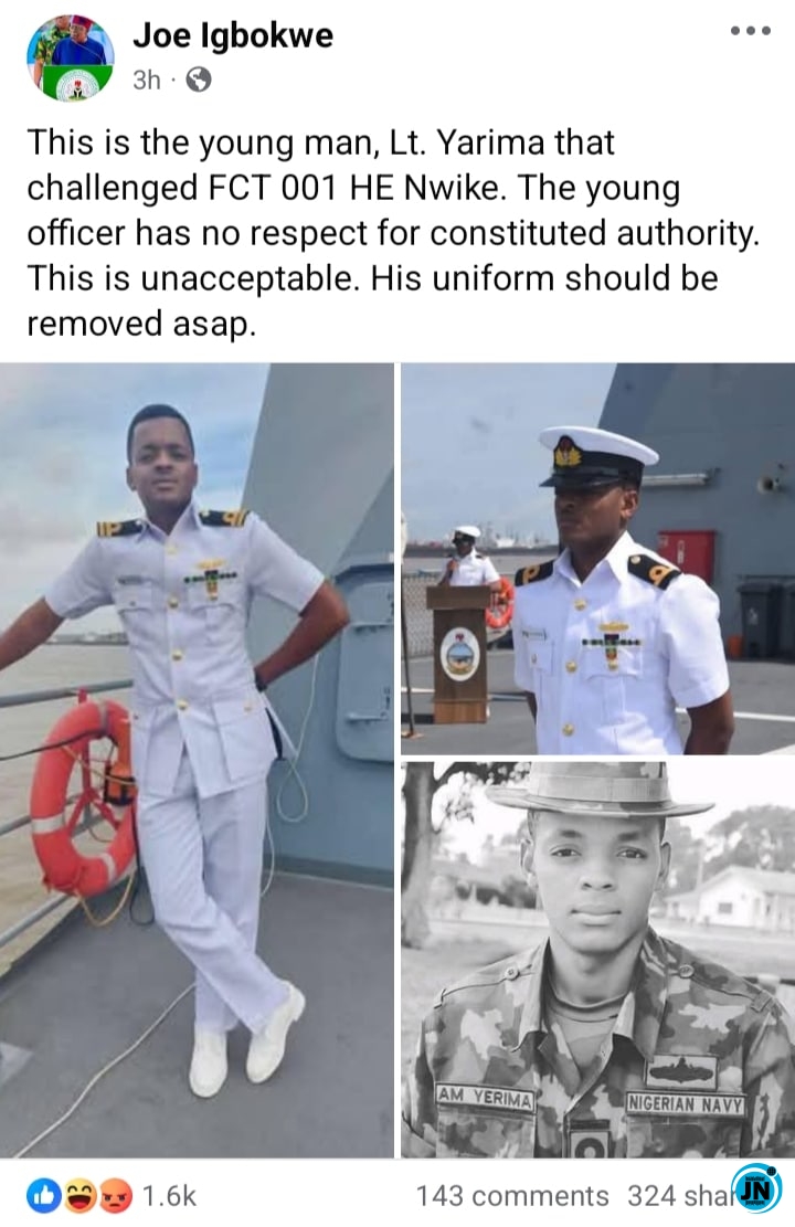 In his post, Igbokwe wrote: “Who is this man in uniform? Of what meat is he fed? Who is beating the drum for him? This is unacceptable! His uniform has to be removed. This is the young man, Lt. Yarima, that challenged FCT 001, His Excellency Nyesom Wike. The young officer has no respect for constituted authority. This is unacceptable. His uniform should be removed immediately.”