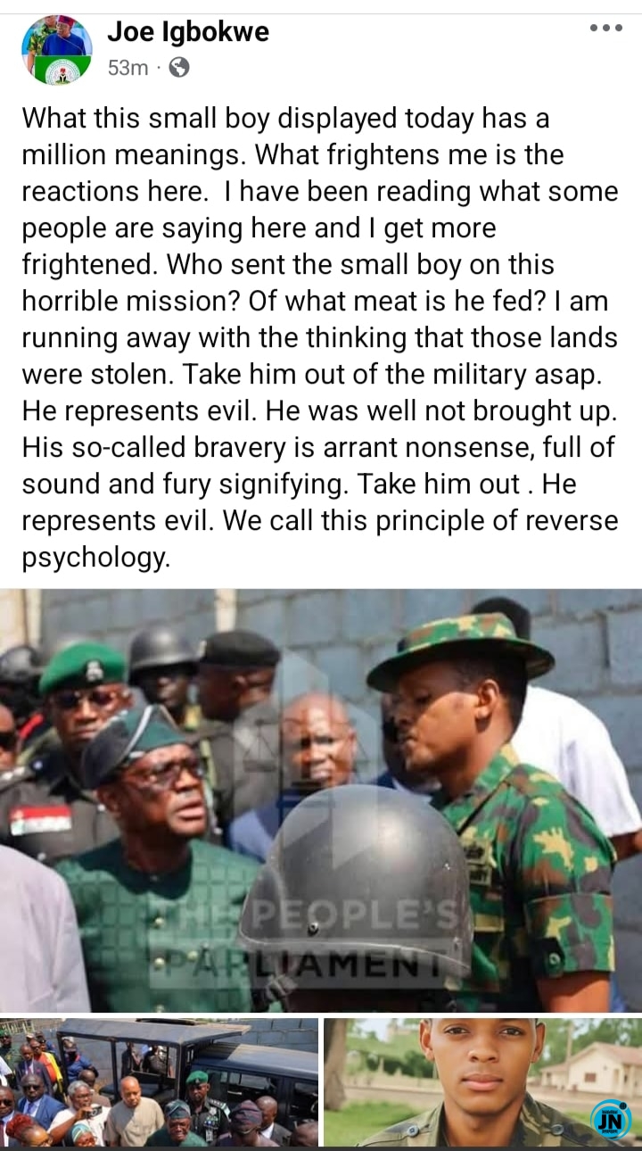 Reacting via his official Facebook page, Joe Igbokwe berated the soldier’s behavior, describing it as “a complete breakdown of discipline” within the military ranks. He called for immediate disciplinary action, arguing that no uniformed officer should publicly challenge a serving minister of the Federal Republic of Nigeria.