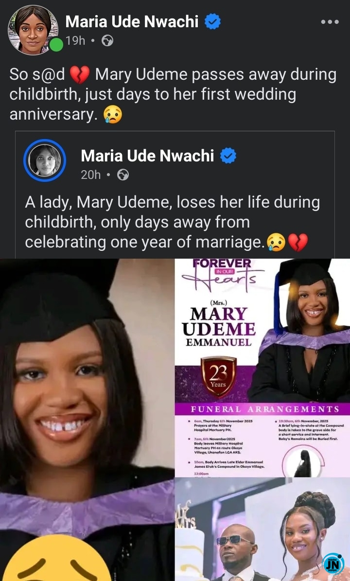 The devastating news was first shared online by Maria Ude Nwachi via Facebook, where the post immediately drew an outpouring of grief, sympathy, and prayers from Nigerians saddened by the loss.