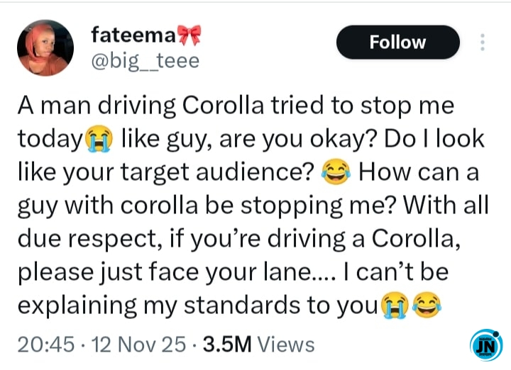 In the video, she can be heard laughing as she narrates the incident, telling viewers, “A man driving Corolla tried to stop me today 😭 like guy, are you okay? Do I look like your target audience? 😂 How can a guy with Corolla be stopping me? With all due respect, if you’re driving a Corolla, please just face your lane…. I can’t be explaining my standards to you 😭😂.” Her expressive tone and humor made the post highly shareable, with many users reacting through comments, reposts, and memes.
