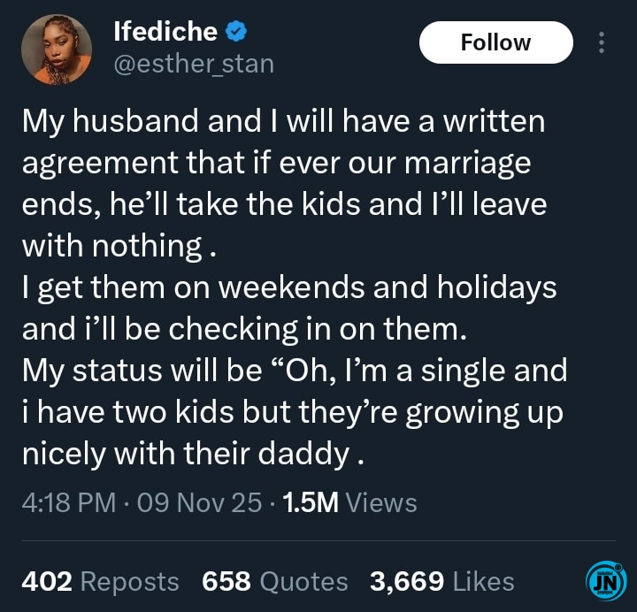 A young lady has triggered widespread discussion across social media after openly declaring that if her marriage ever collapses, she is fully prepared to walk away from everything — including full custody of her children — leaving them entirely in their father’s care.