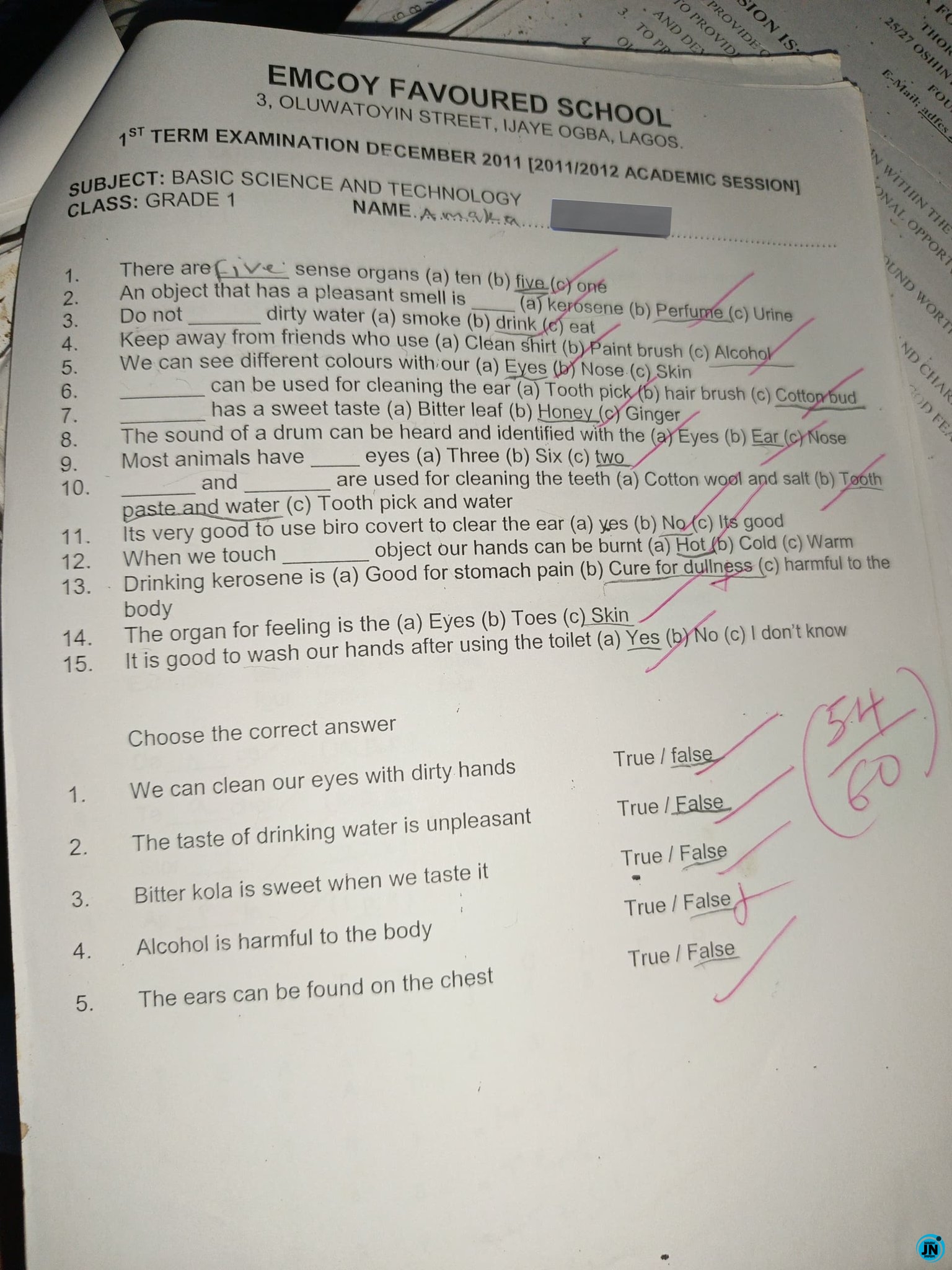Despite these questionable answers, she achieved a commendable overall score of 54 out of 60, which highlights her strong performance in the rest of the exam.