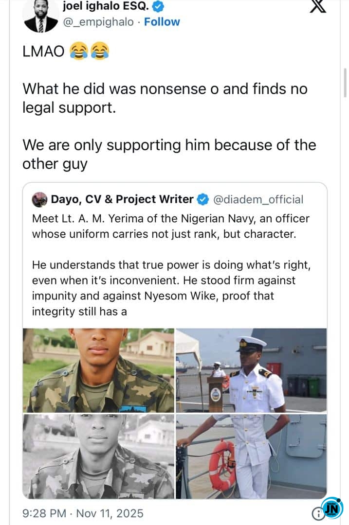 A Nigerian lawyer has stirred major conversations online after sharing a strong reaction to the growing support for Lt Yerima in the now-viral video where the naval officer blocked FCT Minister Nyesom Wike from accessing a property in Abuja.