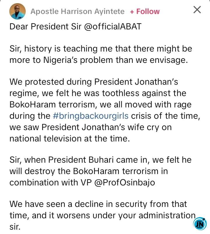 The clergyman, Apostle Harrison Ayintele, took to TikTok to express his deep concerns regarding the current state of security in Nigeria. In his post, he highlighted that the safety of citizens has deteriorated significantly under the administration of President Bola Ahmed Tinubu. Ayintele emphasized that many Nigerians now live in fear and are traumatized by repeated attacks, citing incidents of abductions and killings, particularly in Northern Nigeria, which he described as bordering on genocide.