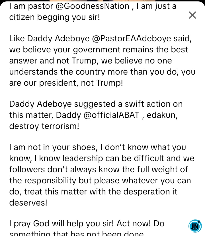 The solo protest by Pastor Ayintele symbolizes the growing frustration of ordinary Nigerians who feel vulnerable and inadequately protected in the face of violent attacks. His message to the President underscores the urgent need for stronger security measures, improved intelligence operations, and a more proactive approach to tackling terrorism and organized crime across Nigeria.